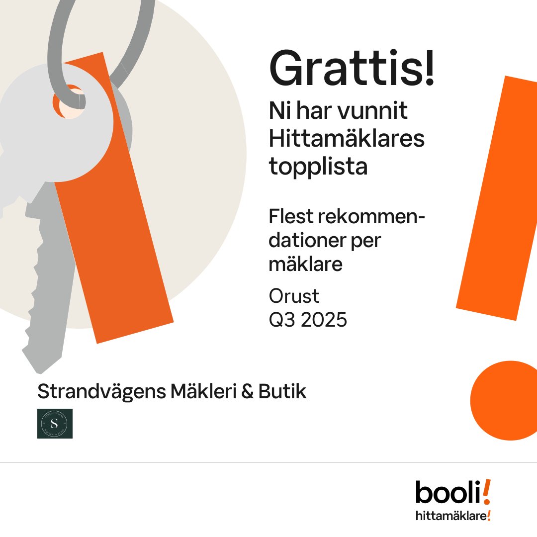 Statistik för publicerade bostäder, försäljningar och omdömen baseras på data från Booli och Hittamäklare. Statistiken för försäljningar avser inrapporterade och verifierade slutpriser från mäklare eller av Booli inhämtade och verifierade slutpriser. Statistiken för publicerade bostäder baseras på information som publicerats på Booli.se. Statistik för omdömen och rekommendationer baseras på omdömen från säljare som lämnats via Booli och Hittamäklare.
