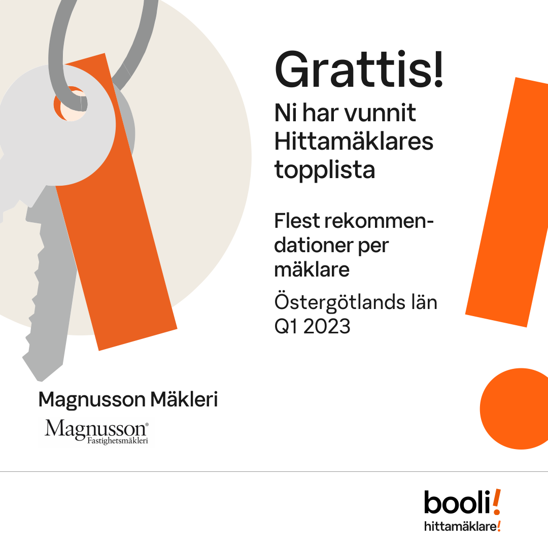 Statistik för publicerade bostäder, försäljningar och omdömen baseras på data från Booli och Hittamäklare. Statistiken för försäljningar avser inrapporterade och verifierade slutpriser från mäklare eller av Booli inhämtade och verifierade slutpriser. Statistiken för publicerade bostäder baseras på information som publicerats på Booli.se. Statistik för omdömen och rekommendationer baseras på omdömen från säljare som lämnats via Booli och Hittamäklare.