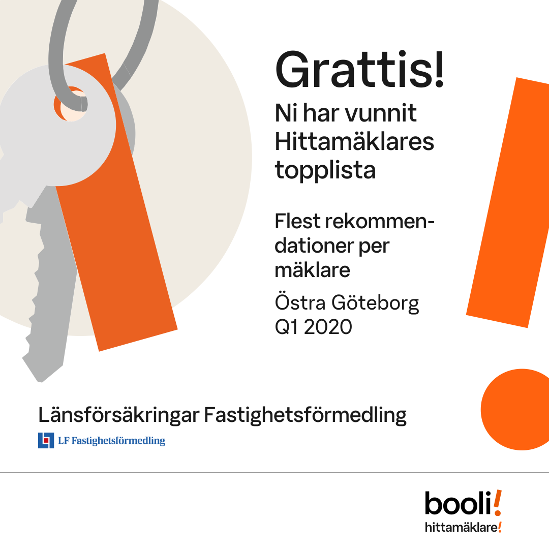 Statistik för publicerade bostäder, försäljningar och omdömen baseras på data från Booli och Hittamäklare. Statistiken för försäljningar avser inrapporterade och verifierade slutpriser från mäklare eller av Booli inhämtade och verifierade slutpriser. Statistiken för publicerade bostäder baseras på information som publicerats på Booli.se. Statistik för omdömen och rekommendationer baseras på omdömen från säljare som lämnats via Booli och Hittamäklare.
