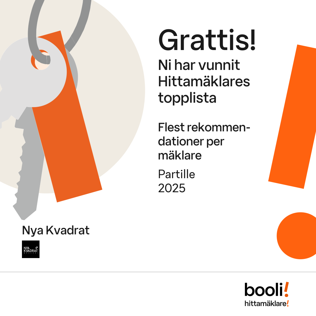 Statistik för publicerade bostäder, försäljningar och omdömen baseras på data från Booli och Hittamäklare. Statistiken för försäljningar avser inrapporterade och verifierade slutpriser från mäklare eller av Booli inhämtade och verifierade slutpriser. Statistiken för publicerade bostäder baseras på information som publicerats på Booli.se. Statistik för omdömen och rekommendationer baseras på omdömen från säljare som lämnats via Booli och Hittamäklare.
