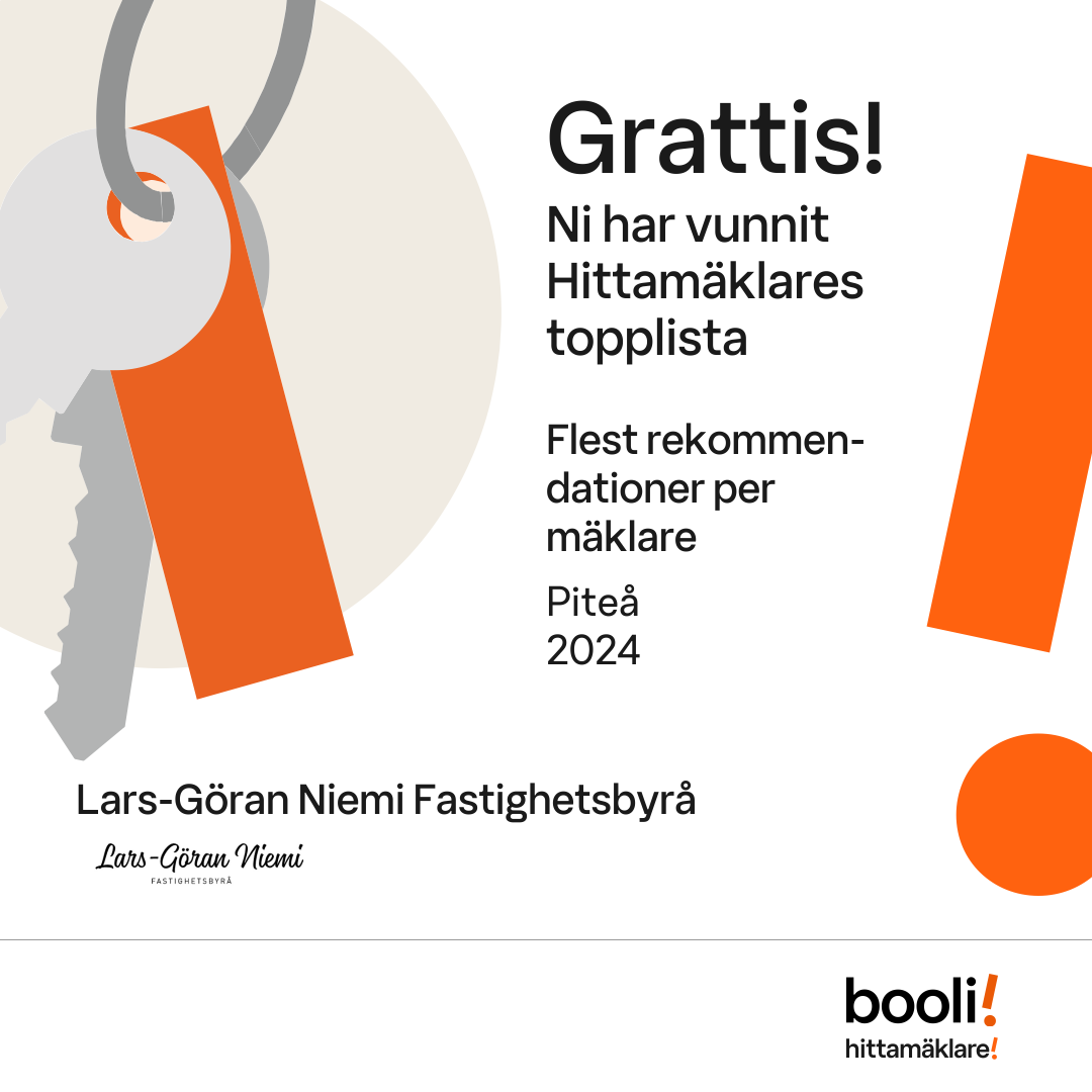 Statistik för publicerade bostäder, försäljningar och omdömen baseras på data från Booli och Hittamäklare. Statistiken för försäljningar avser inrapporterade och verifierade slutpriser från mäklare eller av Booli inhämtade och verifierade slutpriser. Statistiken för publicerade bostäder baseras på information som publicerats på Booli.se. Statistik för omdömen och rekommendationer baseras på omdömen från säljare som lämnats via Booli och Hittamäklare.