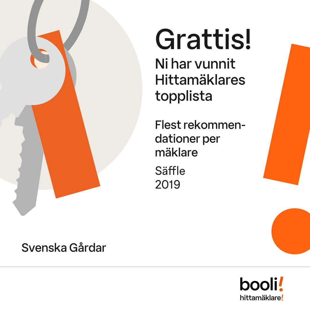Statistik för publicerade bostäder, försäljningar och omdömen baseras på data från Booli och Hittamäklare. Statistiken för försäljningar avser inrapporterade och verifierade slutpriser från mäklare eller av Booli inhämtade och verifierade slutpriser. Statistiken för publicerade bostäder baseras på information som publicerats på Booli.se. Statistik för omdömen och rekommendationer baseras på omdömen från säljare som lämnats via Booli och Hittamäklare.
