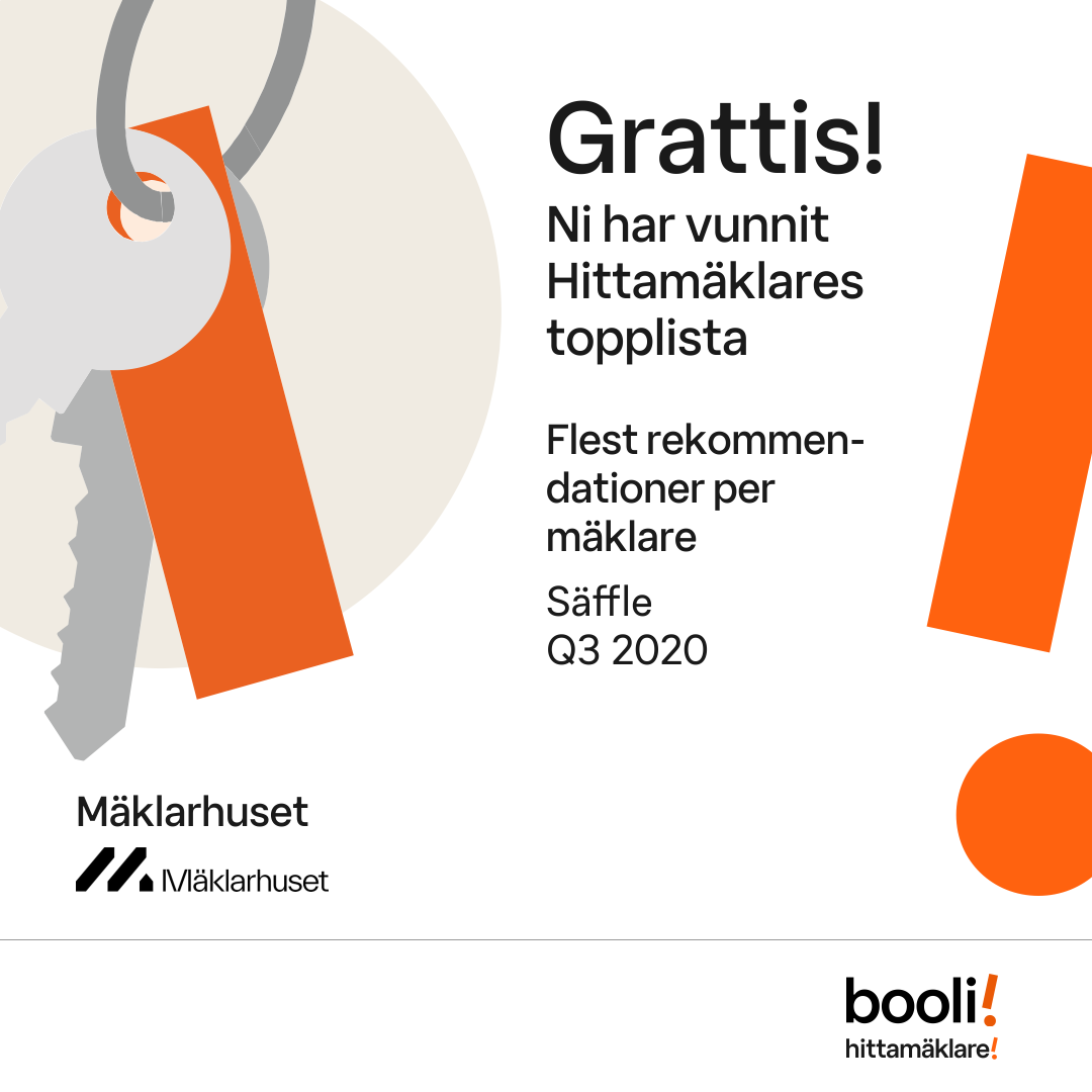 Statistik för publicerade bostäder, försäljningar och omdömen baseras på data från Booli och Hittamäklare. Statistiken för försäljningar avser inrapporterade och verifierade slutpriser från mäklare eller av Booli inhämtade och verifierade slutpriser. Statistiken för publicerade bostäder baseras på information som publicerats på Booli.se. Statistik för omdömen och rekommendationer baseras på omdömen från säljare som lämnats via Booli och Hittamäklare.