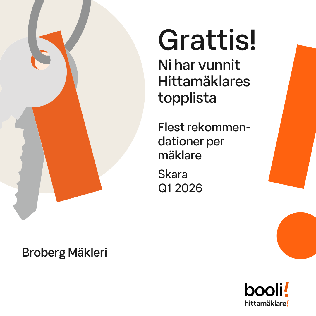 Statistik för publicerade bostäder, försäljningar och omdömen baseras på data från Booli. Statistiken för försäljningar avser inrapporterade och verifierade slutpriser från mäklare eller av Booli inhämtade och verifierade slutpriser. Statistiken för publicerade bostäder baseras på information som publicerats på Booli.se. Statistik för omdömen och rekommendationer baseras på omdömen från säljare som lämnats via Booli.