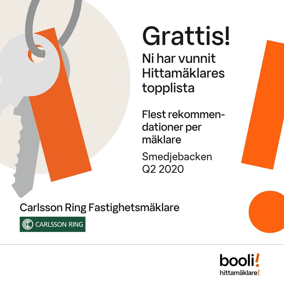 Statistik för publicerade bostäder, försäljningar och omdömen baseras på data från Booli och Hittamäklare. Statistiken för försäljningar avser inrapporterade och verifierade slutpriser från mäklare eller av Booli inhämtade och verifierade slutpriser. Statistiken för publicerade bostäder baseras på information som publicerats på Booli.se. Statistik för omdömen och rekommendationer baseras på omdömen från säljare som lämnats via Booli och Hittamäklare.