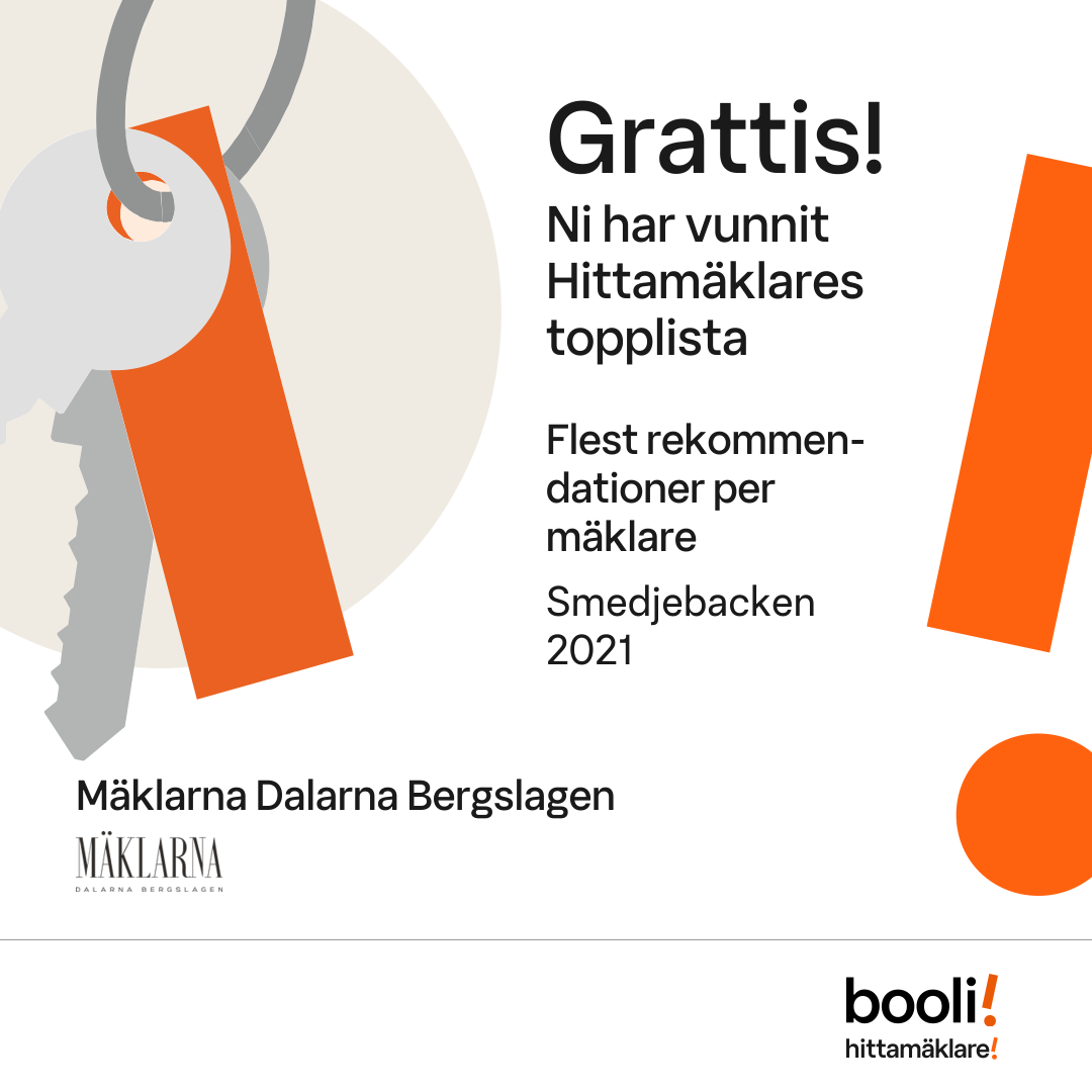 Statistik för publicerade bostäder, försäljningar och omdömen baseras på data från Booli och Hittamäklare. Statistiken för försäljningar avser inrapporterade och verifierade slutpriser från mäklare eller av Booli inhämtade och verifierade slutpriser. Statistiken för publicerade bostäder baseras på information som publicerats på Booli.se. Statistik för omdömen och rekommendationer baseras på omdömen från säljare som lämnats via Booli och Hittamäklare.