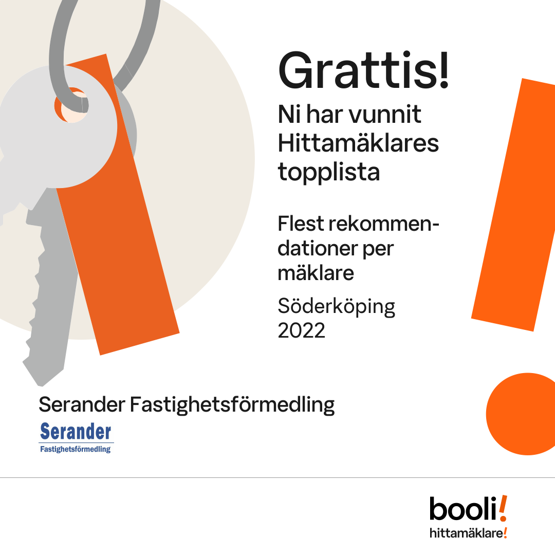 Statistik för publicerade bostäder, försäljningar och omdömen baseras på data från Booli och Hittamäklare. Statistiken för försäljningar avser inrapporterade och verifierade slutpriser från mäklare eller av Booli inhämtade och verifierade slutpriser. Statistiken för publicerade bostäder baseras på information som publicerats på Booli.se. Statistik för omdömen och rekommendationer baseras på omdömen från säljare som lämnats via Booli och Hittamäklare.
