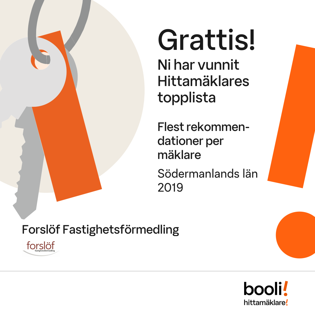 Statistik för publicerade bostäder, försäljningar och omdömen baseras på data från Booli. Statistiken för försäljningar avser inrapporterade och verifierade slutpriser från mäklare eller av Booli inhämtade och verifierade slutpriser. Statistiken för publicerade bostäder baseras på information som publicerats på Booli.se. Statistik för omdömen och rekommendationer baseras på omdömen från säljare som lämnats via Booli.