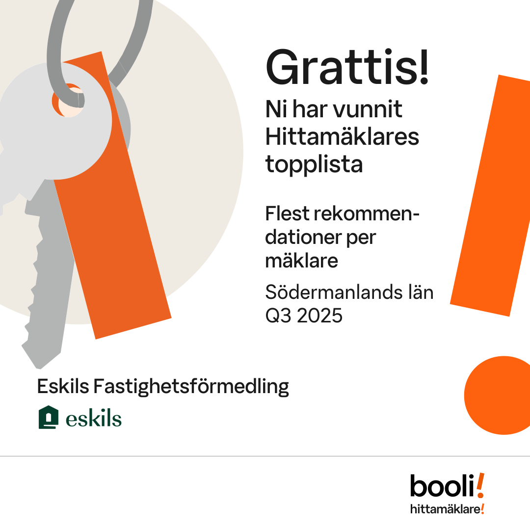 Statistik för publicerade bostäder, försäljningar och omdömen baseras på data från Booli och Hittamäklare. Statistiken för försäljningar avser inrapporterade och verifierade slutpriser från mäklare eller av Booli inhämtade och verifierade slutpriser. Statistiken för publicerade bostäder baseras på information som publicerats på Booli.se. Statistik för omdömen och rekommendationer baseras på omdömen från säljare som lämnats via Booli och Hittamäklare.