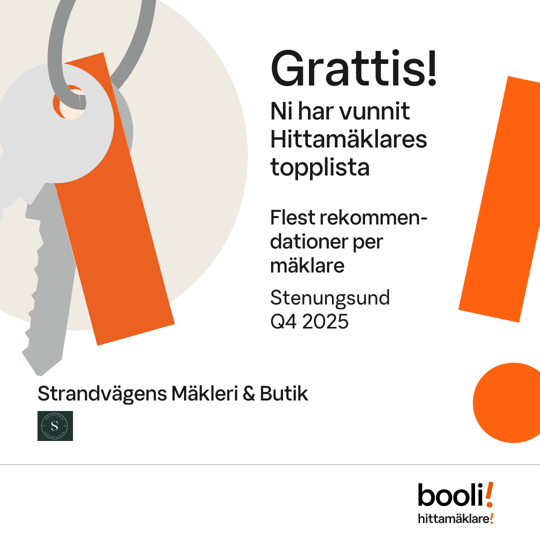 Statistik för publicerade bostäder, försäljningar och omdömen baseras på data från Booli och Hittamäklare. Statistiken för försäljningar avser inrapporterade och verifierade slutpriser från mäklare eller av Booli inhämtade och verifierade slutpriser. Statistiken för publicerade bostäder baseras på information som publicerats på Booli.se. Statistik för omdömen och rekommendationer baseras på omdömen från säljare som lämnats via Booli och Hittamäklare.