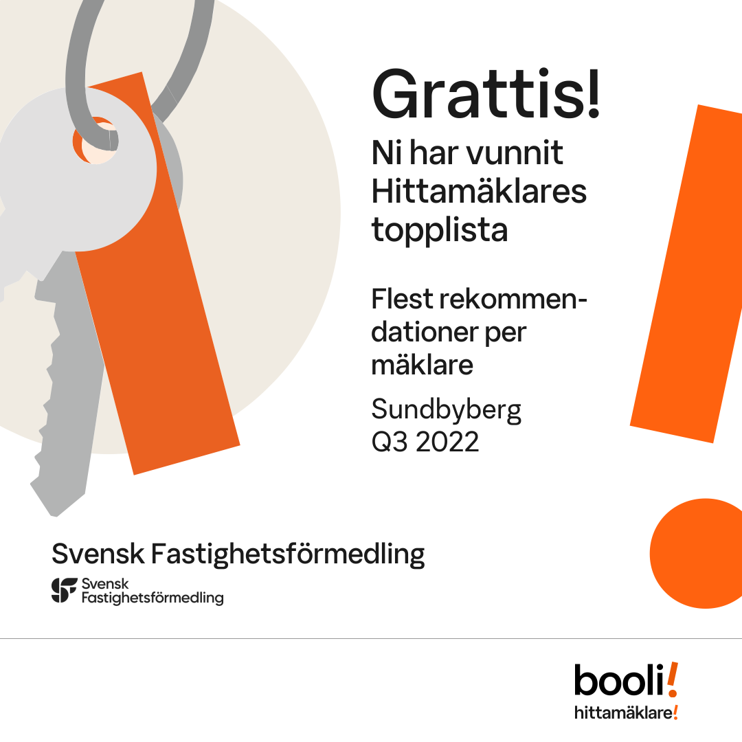Statistik för publicerade bostäder, försäljningar och omdömen baseras på data från Booli och Hittamäklare. Statistiken för försäljningar avser inrapporterade och verifierade slutpriser från mäklare eller av Booli inhämtade och verifierade slutpriser. Statistiken för publicerade bostäder baseras på information som publicerats på Booli.se. Statistik för omdömen och rekommendationer baseras på omdömen från säljare som lämnats via Booli och Hittamäklare.