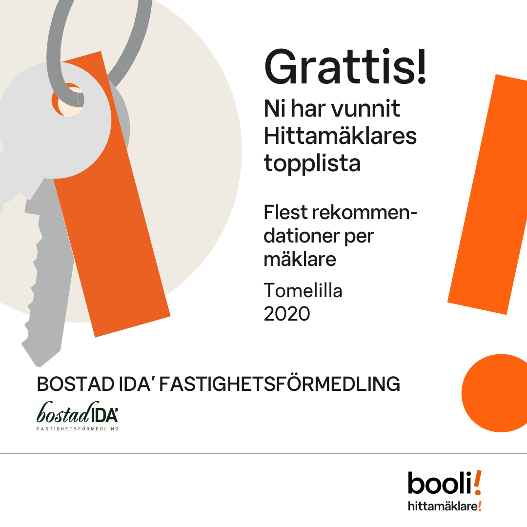 Statistik för publicerade bostäder, försäljningar och omdömen baseras på data från Booli och Hittamäklare. Statistiken för försäljningar avser inrapporterade och verifierade slutpriser från mäklare eller av Booli inhämtade och verifierade slutpriser. Statistiken för publicerade bostäder baseras på information som publicerats på Booli.se. Statistik för omdömen och rekommendationer baseras på omdömen från säljare som lämnats via Booli och Hittamäklare.