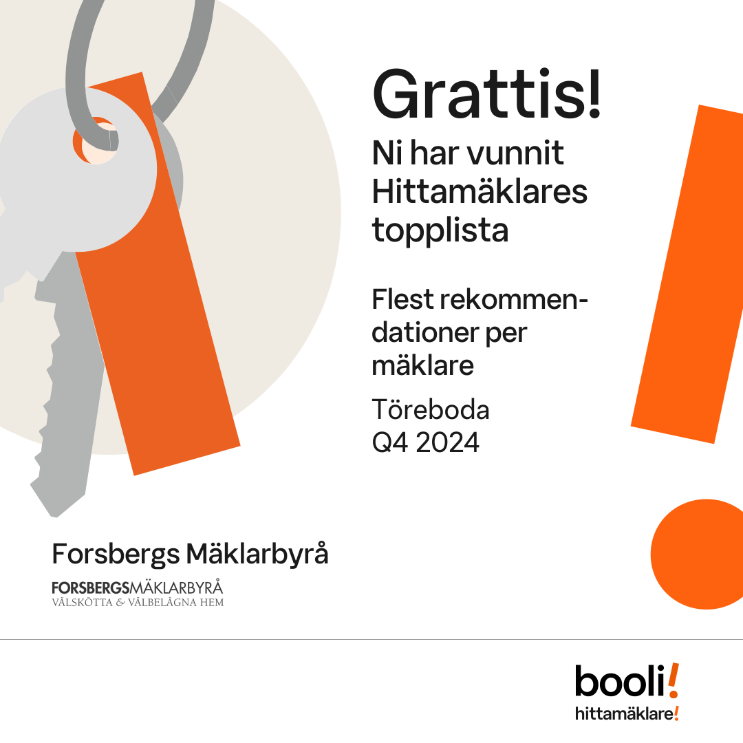 Statistik för publicerade bostäder, försäljningar och omdömen baseras på data från Booli och Hittamäklare. Statistiken för försäljningar avser inrapporterade och verifierade slutpriser från mäklare eller av Booli inhämtade och verifierade slutpriser. Statistiken för publicerade bostäder baseras på information som publicerats på Booli.se. Statistik för omdömen och rekommendationer baseras på omdömen från säljare som lämnats via Booli och Hittamäklare.