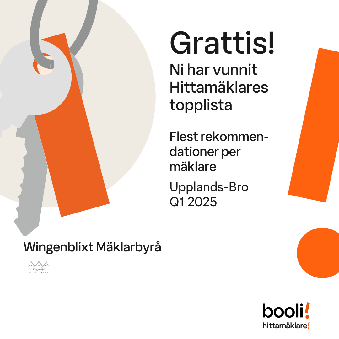 Statistik för publicerade bostäder, försäljningar och omdömen baseras på data från Booli och Hittamäklare. Statistiken för försäljningar avser inrapporterade och verifierade slutpriser från mäklare eller av Booli inhämtade och verifierade slutpriser. Statistiken för publicerade bostäder baseras på information som publicerats på Booli.se. Statistik för omdömen och rekommendationer baseras på omdömen från säljare som lämnats via Booli och Hittamäklare.