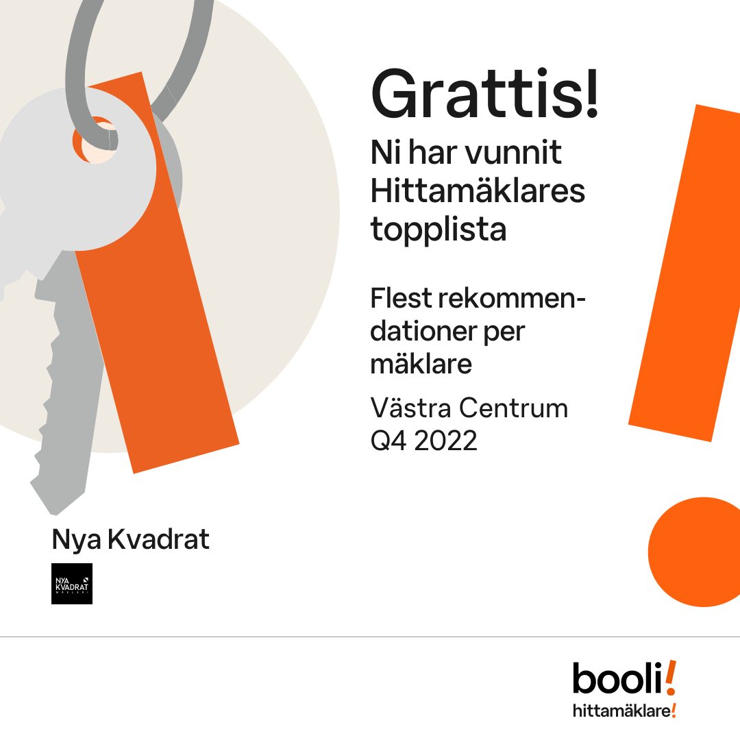 Statistik för publicerade bostäder, försäljningar och omdömen baseras på data från Booli och Hittamäklare. Statistiken för försäljningar avser inrapporterade och verifierade slutpriser från mäklare eller av Booli inhämtade och verifierade slutpriser. Statistiken för publicerade bostäder baseras på information som publicerats på Booli.se. Statistik för omdömen och rekommendationer baseras på omdömen från säljare som lämnats via Booli och Hittamäklare.