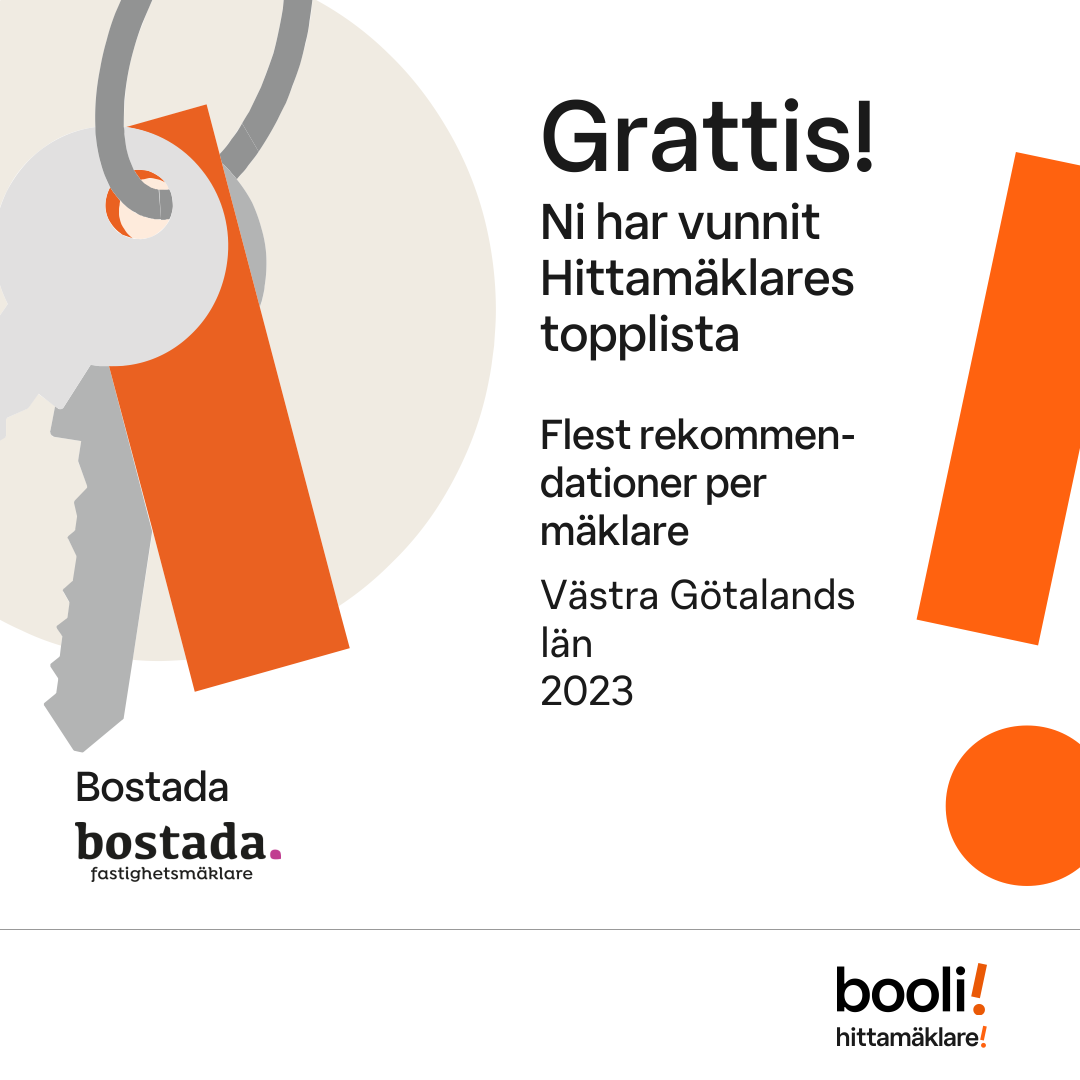 Statistik för publicerade bostäder, försäljningar och omdömen baseras på data från Booli och Hittamäklare. Statistiken för försäljningar avser inrapporterade och verifierade slutpriser från mäklare eller av Booli inhämtade och verifierade slutpriser. Statistiken för publicerade bostäder baseras på information som publicerats på Booli.se. Statistik för omdömen och rekommendationer baseras på omdömen från säljare som lämnats via Booli och Hittamäklare.