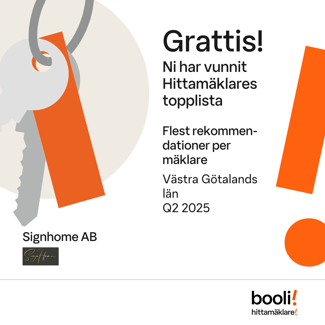 Statistik för publicerade bostäder, försäljningar och omdömen baseras på data från Booli och Hittamäklare. Statistiken för försäljningar avser inrapporterade och verifierade slutpriser från mäklare eller av Booli inhämtade och verifierade slutpriser. Statistiken för publicerade bostäder baseras på information som publicerats på Booli.se. Statistik för omdömen och rekommendationer baseras på omdömen från säljare som lämnats via Booli och Hittamäklare.