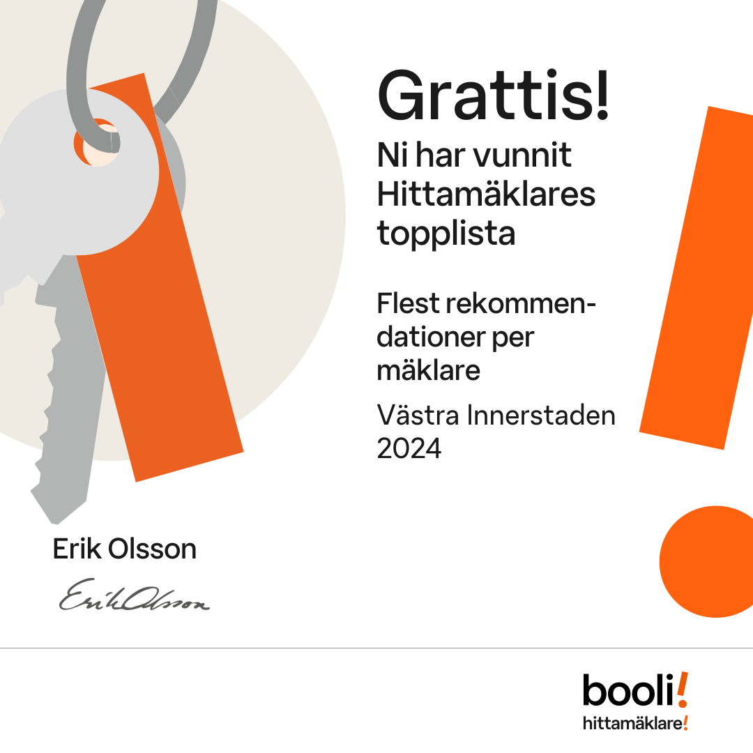 Statistik för publicerade bostäder, försäljningar och omdömen baseras på data från Booli och Hittamäklare. Statistiken för försäljningar avser inrapporterade och verifierade slutpriser från mäklare eller av Booli inhämtade och verifierade slutpriser. Statistiken för publicerade bostäder baseras på information som publicerats på Booli.se. Statistik för omdömen och rekommendationer baseras på omdömen från säljare som lämnats via Booli och Hittamäklare.