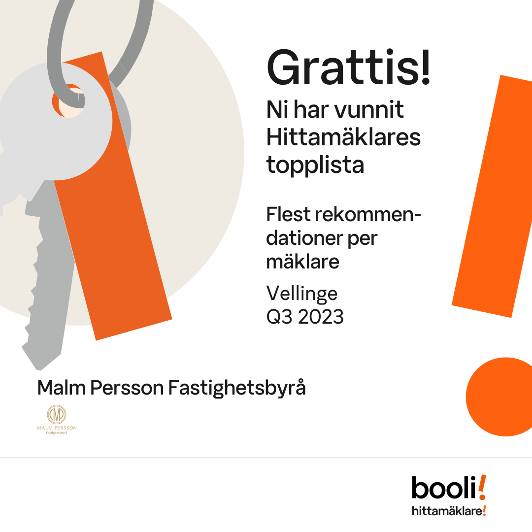 Statistik för publicerade bostäder, försäljningar och omdömen baseras på data från Booli och Hittamäklare. Statistiken för försäljningar avser inrapporterade och verifierade slutpriser från mäklare eller av Booli inhämtade och verifierade slutpriser. Statistiken för publicerade bostäder baseras på information som publicerats på Booli.se. Statistik för omdömen och rekommendationer baseras på omdömen från säljare som lämnats via Booli och Hittamäklare.