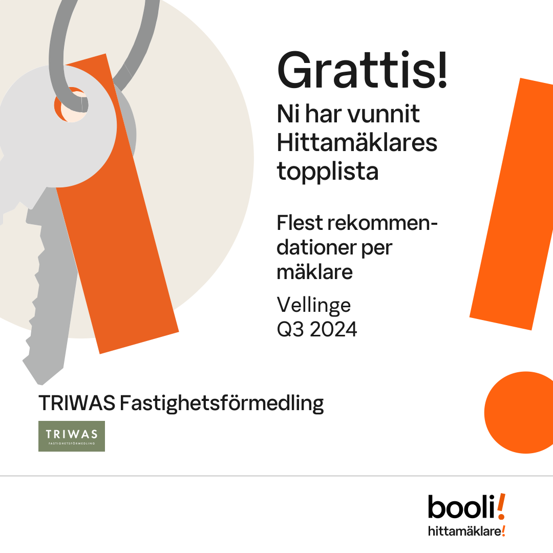 Statistik för publicerade bostäder, försäljningar och omdömen baseras på data från Booli och Hittamäklare. Statistiken för försäljningar avser inrapporterade och verifierade slutpriser från mäklare eller av Booli inhämtade och verifierade slutpriser. Statistiken för publicerade bostäder baseras på information som publicerats på Booli.se. Statistik för omdömen och rekommendationer baseras på omdömen från säljare som lämnats via Booli och Hittamäklare.