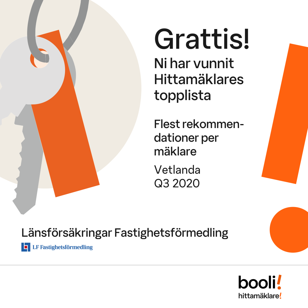 Statistik för publicerade bostäder, försäljningar och omdömen baseras på data från Booli och Hittamäklare. Statistiken för försäljningar avser inrapporterade och verifierade slutpriser från mäklare eller av Booli inhämtade och verifierade slutpriser. Statistiken för publicerade bostäder baseras på information som publicerats på Booli.se. Statistik för omdömen och rekommendationer baseras på omdömen från säljare som lämnats via Booli och Hittamäklare.