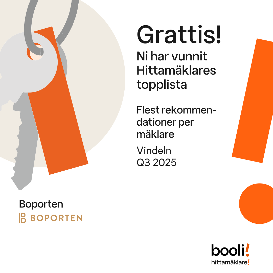 Statistik för publicerade bostäder, försäljningar och omdömen baseras på data från Booli och Hittamäklare. Statistiken för försäljningar avser inrapporterade och verifierade slutpriser från mäklare eller av Booli inhämtade och verifierade slutpriser. Statistiken för publicerade bostäder baseras på information som publicerats på Booli.se. Statistik för omdömen och rekommendationer baseras på omdömen från säljare som lämnats via Booli och Hittamäklare.