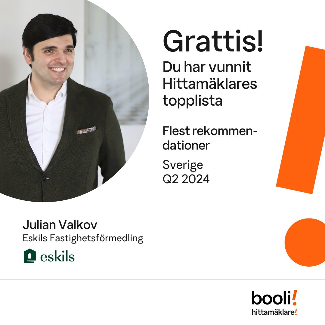 Statistik för publicerade bostäder, försäljningar och omdömen baseras på data från Booli och Hittamäklare. Statistiken för försäljningar avser inrapporterade och verifierade slutpriser från mäklare eller av Booli inhämtade och verifierade slutpriser. Statistiken för publicerade bostäder baseras på information som publicerats på Booli.se. Statistik för omdömen och rekommendationer baseras på omdömen från säljare som lämnats via Booli och Hittamäklare.