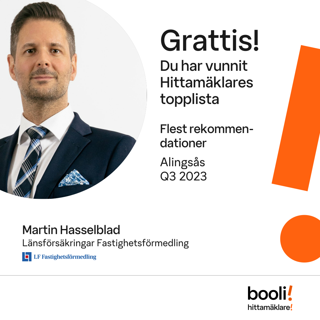 Statistik för publicerade bostäder, försäljningar och omdömen baseras på data från Booli och Hittamäklare. Statistiken för försäljningar avser inrapporterade och verifierade slutpriser från mäklare eller av Booli inhämtade och verifierade slutpriser. Statistiken för publicerade bostäder baseras på information som publicerats på Booli.se. Statistik för omdömen och rekommendationer baseras på omdömen från säljare som lämnats via Booli och Hittamäklare.
