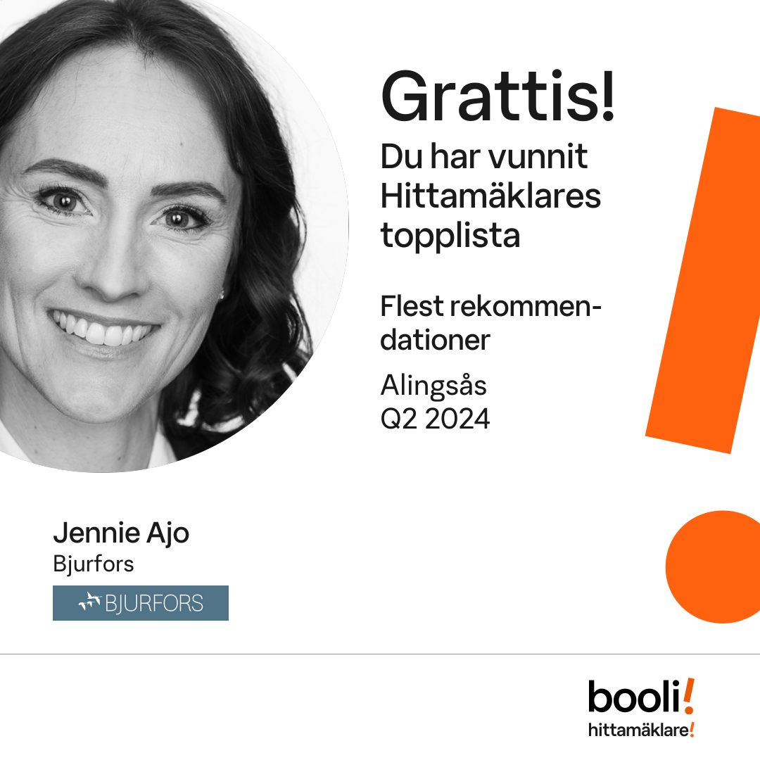 Statistik för publicerade bostäder, försäljningar och omdömen baseras på data från Booli och Hittamäklare. Statistiken för försäljningar avser inrapporterade och verifierade slutpriser från mäklare eller av Booli inhämtade och verifierade slutpriser. Statistiken för publicerade bostäder baseras på information som publicerats på Booli.se. Statistik för omdömen och rekommendationer baseras på omdömen från säljare som lämnats via Booli och Hittamäklare.