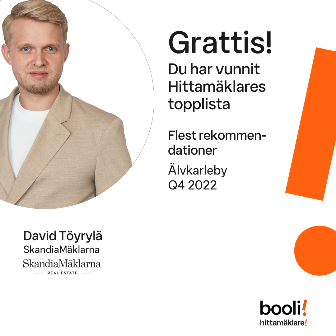 Statistik för publicerade bostäder, försäljningar och omdömen baseras på data från Booli och Hittamäklare. Statistiken för försäljningar avser inrapporterade och verifierade slutpriser från mäklare eller av Booli inhämtade och verifierade slutpriser. Statistiken för publicerade bostäder baseras på information som publicerats på Booli.se. Statistik för omdömen och rekommendationer baseras på omdömen från säljare som lämnats via Booli och Hittamäklare.
