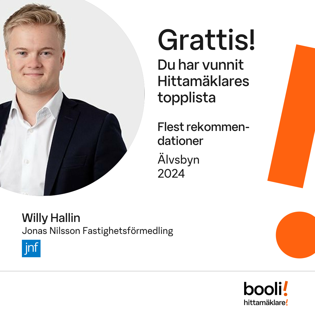 Statistik för publicerade bostäder, försäljningar och omdömen baseras på data från Booli och Hittamäklare. Statistiken för försäljningar avser inrapporterade och verifierade slutpriser från mäklare eller av Booli inhämtade och verifierade slutpriser. Statistiken för publicerade bostäder baseras på information som publicerats på Booli.se. Statistik för omdömen och rekommendationer baseras på omdömen från säljare som lämnats via Booli och Hittamäklare.