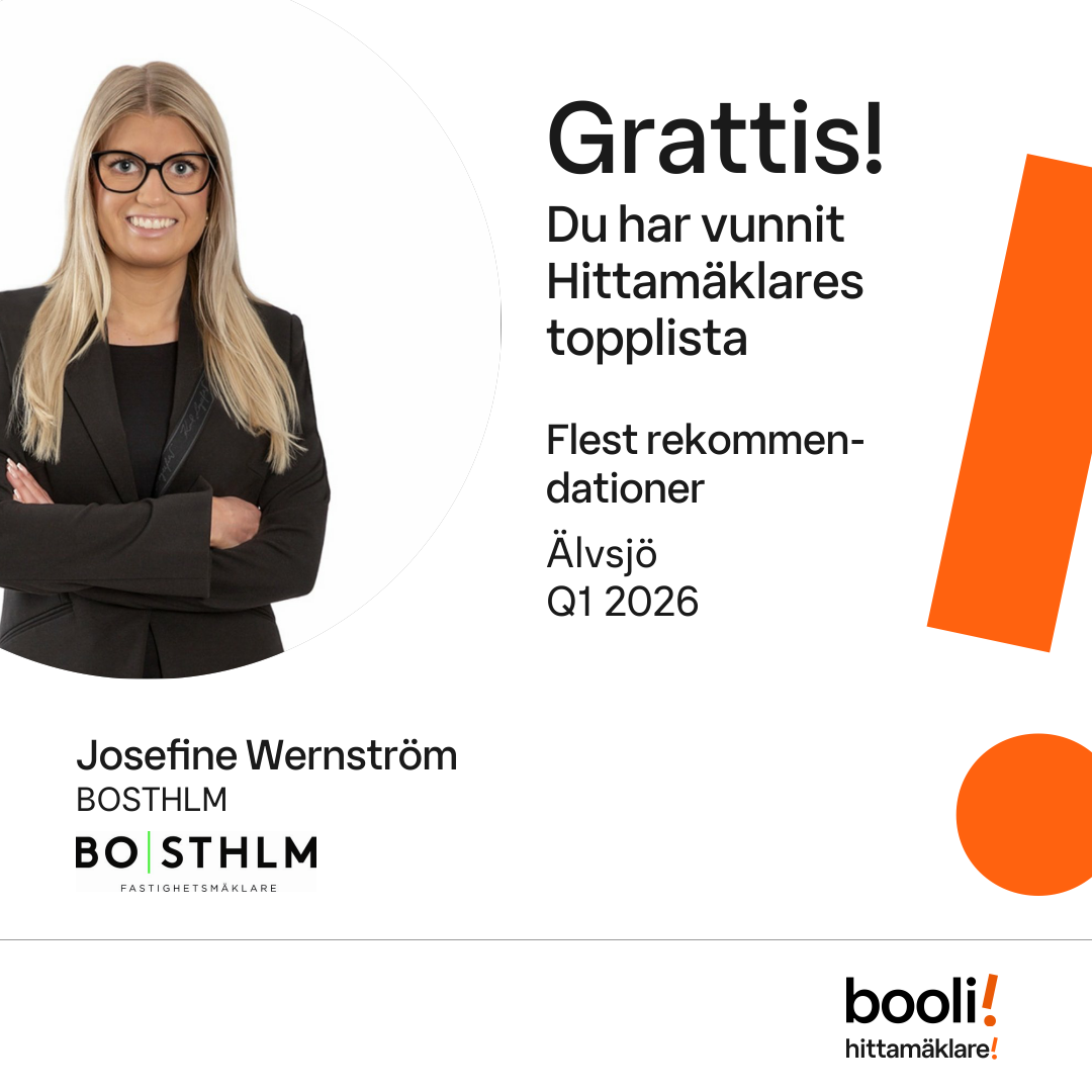 Statistik för publicerade bostäder, försäljningar och omdömen baseras på data från Booli. Statistiken för försäljningar avser inrapporterade och verifierade slutpriser från mäklare eller av Booli inhämtade och verifierade slutpriser. Statistiken för publicerade bostäder baseras på information som publicerats på Booli.se. Statistik för omdömen och rekommendationer baseras på omdömen från säljare som lämnats via Booli.