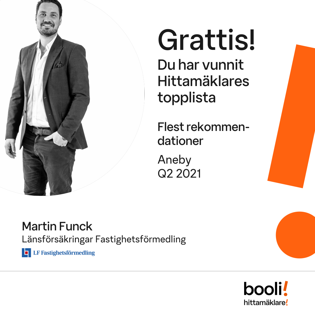 Statistik för publicerade bostäder, försäljningar och omdömen baseras på data från Booli och Hittamäklare. Statistiken för försäljningar avser inrapporterade och verifierade slutpriser från mäklare eller av Booli inhämtade och verifierade slutpriser. Statistiken för publicerade bostäder baseras på information som publicerats på Booli.se. Statistik för omdömen och rekommendationer baseras på omdömen från säljare som lämnats via Booli och Hittamäklare.