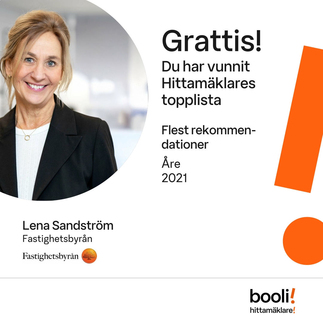 Statistik för publicerade bostäder, försäljningar och omdömen baseras på data från Booli och Hittamäklare. Statistiken för försäljningar avser inrapporterade och verifierade slutpriser från mäklare eller av Booli inhämtade och verifierade slutpriser. Statistiken för publicerade bostäder baseras på information som publicerats på Booli.se. Statistik för omdömen och rekommendationer baseras på omdömen från säljare som lämnats via Booli och Hittamäklare.