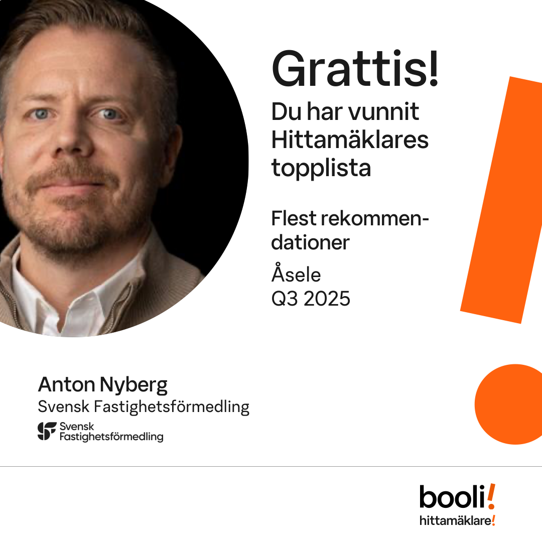 Statistik för publicerade bostäder, försäljningar och omdömen baseras på data från Booli och Hittamäklare. Statistiken för försäljningar avser inrapporterade och verifierade slutpriser från mäklare eller av Booli inhämtade och verifierade slutpriser. Statistiken för publicerade bostäder baseras på information som publicerats på Booli.se. Statistik för omdömen och rekommendationer baseras på omdömen från säljare som lämnats via Booli och Hittamäklare.
