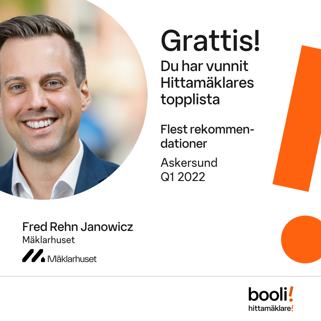 Statistik för publicerade bostäder, försäljningar och omdömen baseras på data från Booli och Hittamäklare. Statistiken för försäljningar avser inrapporterade och verifierade slutpriser från mäklare eller av Booli inhämtade och verifierade slutpriser. Statistiken för publicerade bostäder baseras på information som publicerats på Booli.se. Statistik för omdömen och rekommendationer baseras på omdömen från säljare som lämnats via Booli och Hittamäklare.