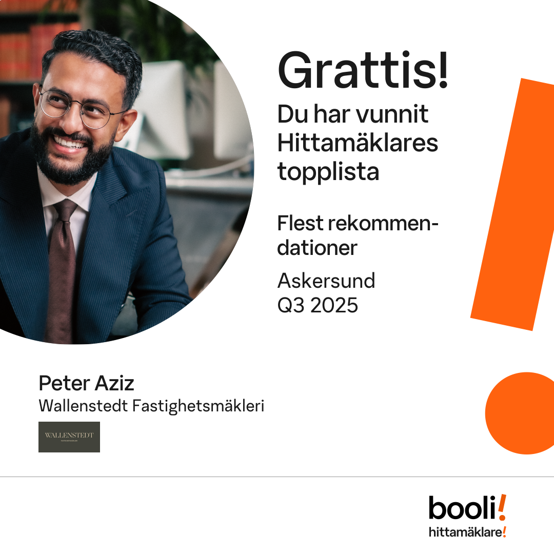 Statistik för publicerade bostäder, försäljningar och omdömen baseras på data från Booli. Statistiken för försäljningar avser inrapporterade och verifierade slutpriser från mäklare eller av Booli inhämtade och verifierade slutpriser. Statistiken för publicerade bostäder baseras på information som publicerats på Booli.se. Statistik för omdömen och rekommendationer baseras på omdömen från säljare som lämnats via Booli.