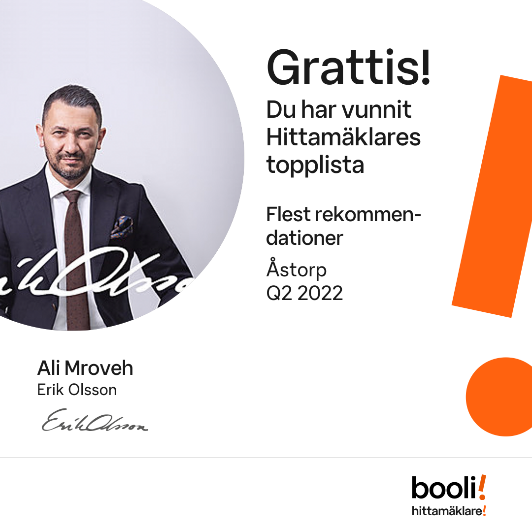Statistik för publicerade bostäder, försäljningar och omdömen baseras på data från Booli och Hittamäklare. Statistiken för försäljningar avser inrapporterade och verifierade slutpriser från mäklare eller av Booli inhämtade och verifierade slutpriser. Statistiken för publicerade bostäder baseras på information som publicerats på Booli.se. Statistik för omdömen och rekommendationer baseras på omdömen från säljare som lämnats via Booli och Hittamäklare.