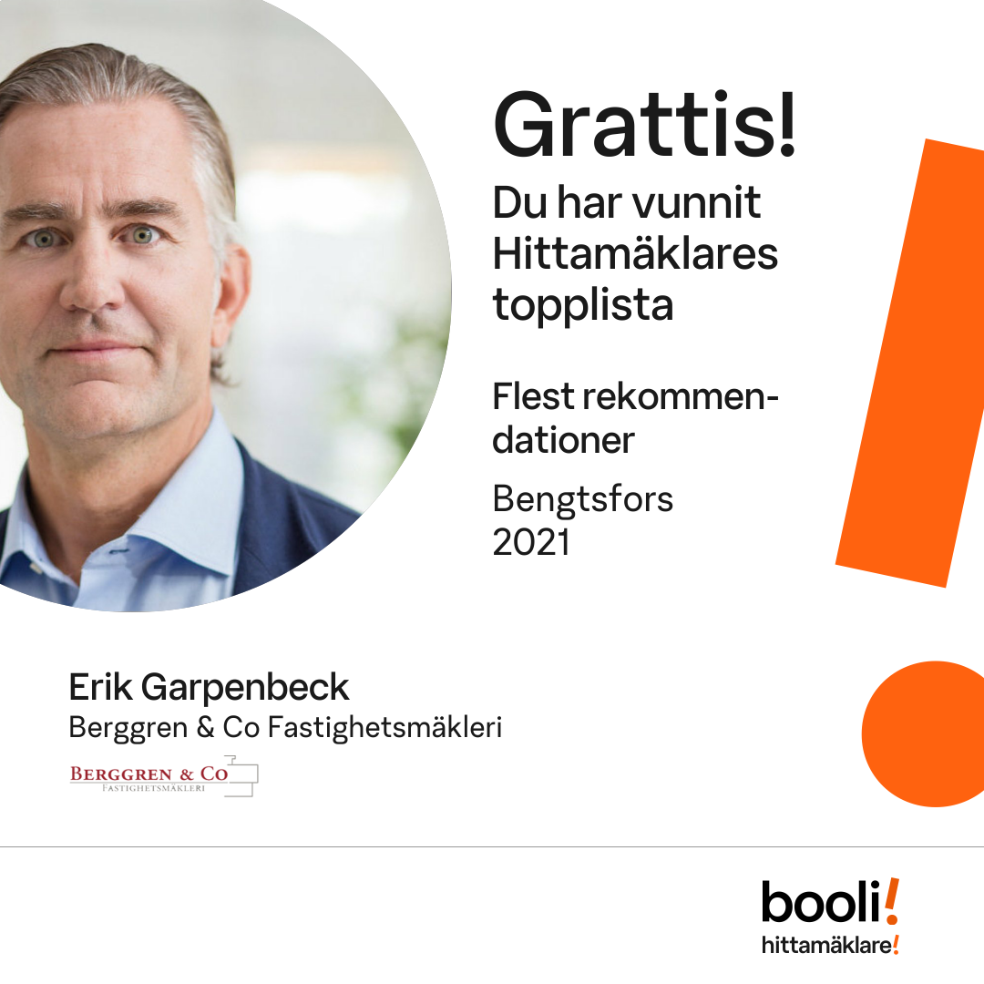 Statistik för publicerade bostäder, försäljningar och omdömen baseras på data från Booli och Hittamäklare. Statistiken för försäljningar avser inrapporterade och verifierade slutpriser från mäklare eller av Booli inhämtade och verifierade slutpriser. Statistiken för publicerade bostäder baseras på information som publicerats på Booli.se. Statistik för omdömen och rekommendationer baseras på omdömen från säljare som lämnats via Booli och Hittamäklare.