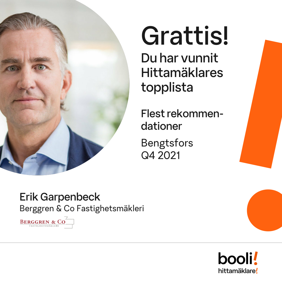 Statistik för publicerade bostäder, försäljningar och omdömen baseras på data från Booli och Hittamäklare. Statistiken för försäljningar avser inrapporterade och verifierade slutpriser från mäklare eller av Booli inhämtade och verifierade slutpriser. Statistiken för publicerade bostäder baseras på information som publicerats på Booli.se. Statistik för omdömen och rekommendationer baseras på omdömen från säljare som lämnats via Booli och Hittamäklare.