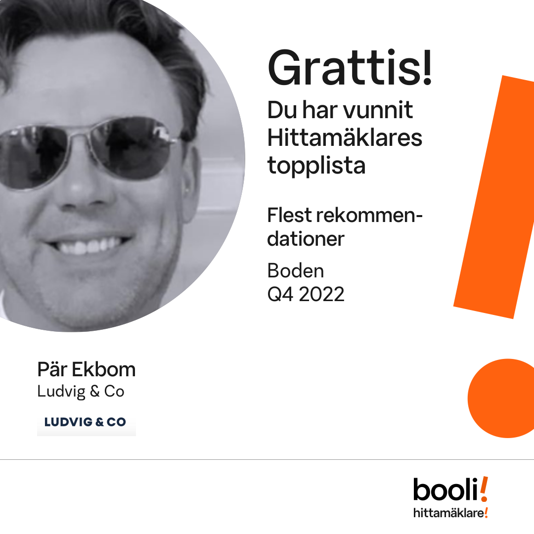 Statistik för publicerade bostäder, försäljningar och omdömen baseras på data från Booli och Hittamäklare. Statistiken för försäljningar avser inrapporterade och verifierade slutpriser från mäklare eller av Booli inhämtade och verifierade slutpriser. Statistiken för publicerade bostäder baseras på information som publicerats på Booli.se. Statistik för omdömen och rekommendationer baseras på omdömen från säljare som lämnats via Booli och Hittamäklare.