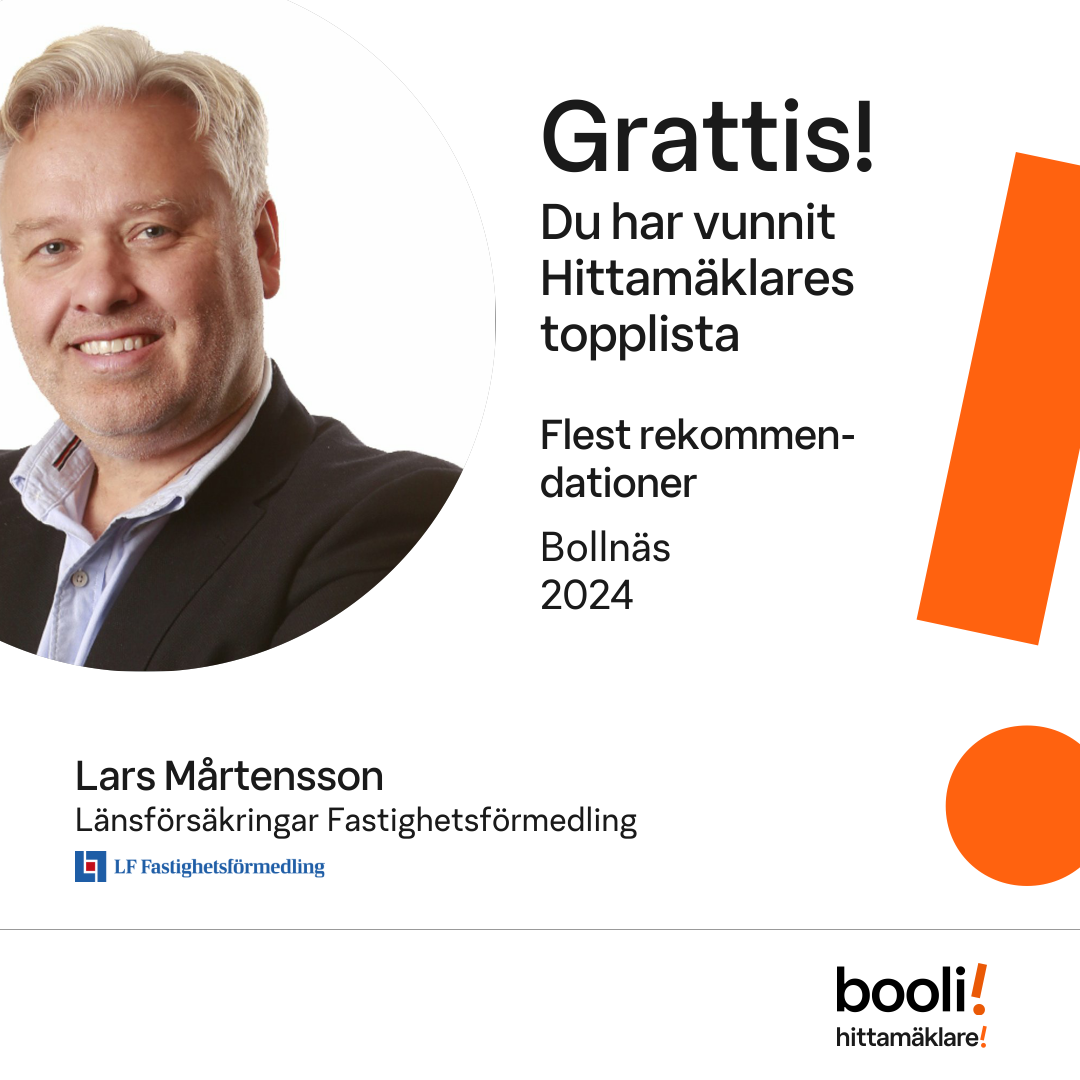 Statistik för publicerade bostäder, försäljningar och omdömen baseras på data från Booli och Hittamäklare. Statistiken för försäljningar avser inrapporterade och verifierade slutpriser från mäklare eller av Booli inhämtade och verifierade slutpriser. Statistiken för publicerade bostäder baseras på information som publicerats på Booli.se. Statistik för omdömen och rekommendationer baseras på omdömen från säljare som lämnats via Booli och Hittamäklare.