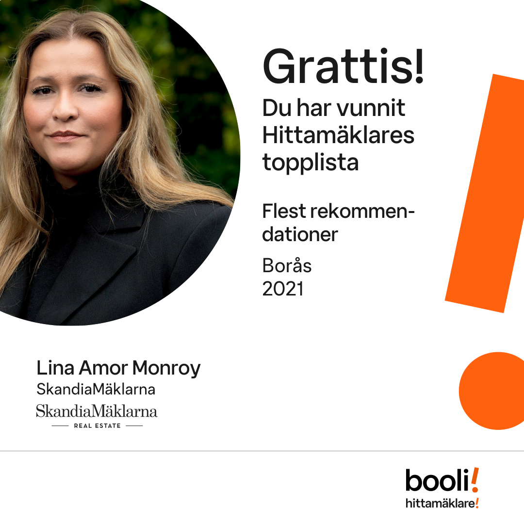 Statistik för publicerade bostäder, försäljningar och omdömen baseras på data från Booli och Hittamäklare. Statistiken för försäljningar avser inrapporterade och verifierade slutpriser från mäklare eller av Booli inhämtade och verifierade slutpriser. Statistiken för publicerade bostäder baseras på information som publicerats på Booli.se. Statistik för omdömen och rekommendationer baseras på omdömen från säljare som lämnats via Booli och Hittamäklare.