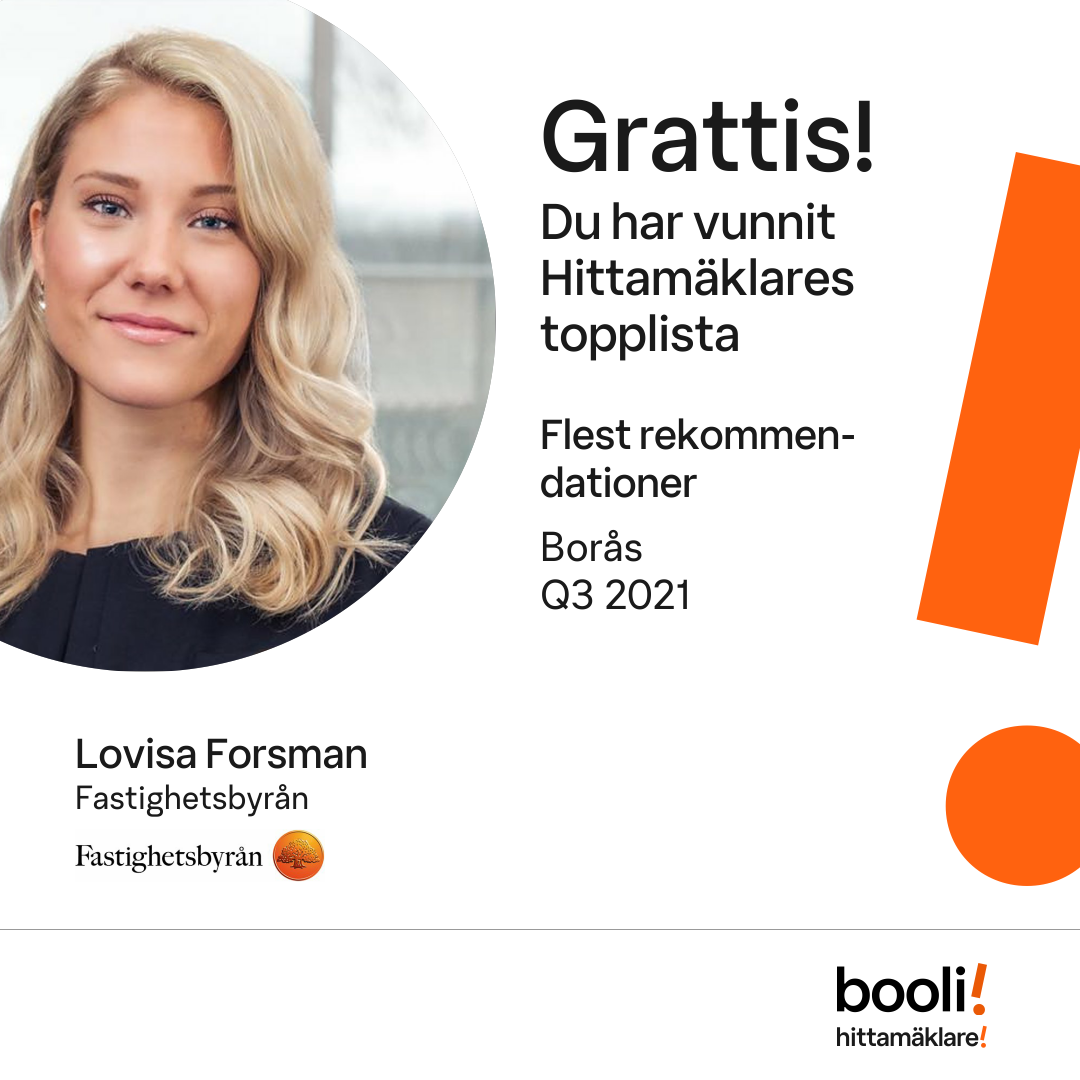 Statistik för publicerade bostäder, försäljningar och omdömen baseras på data från Booli och Hittamäklare. Statistiken för försäljningar avser inrapporterade och verifierade slutpriser från mäklare eller av Booli inhämtade och verifierade slutpriser. Statistiken för publicerade bostäder baseras på information som publicerats på Booli.se. Statistik för omdömen och rekommendationer baseras på omdömen från säljare som lämnats via Booli och Hittamäklare.
