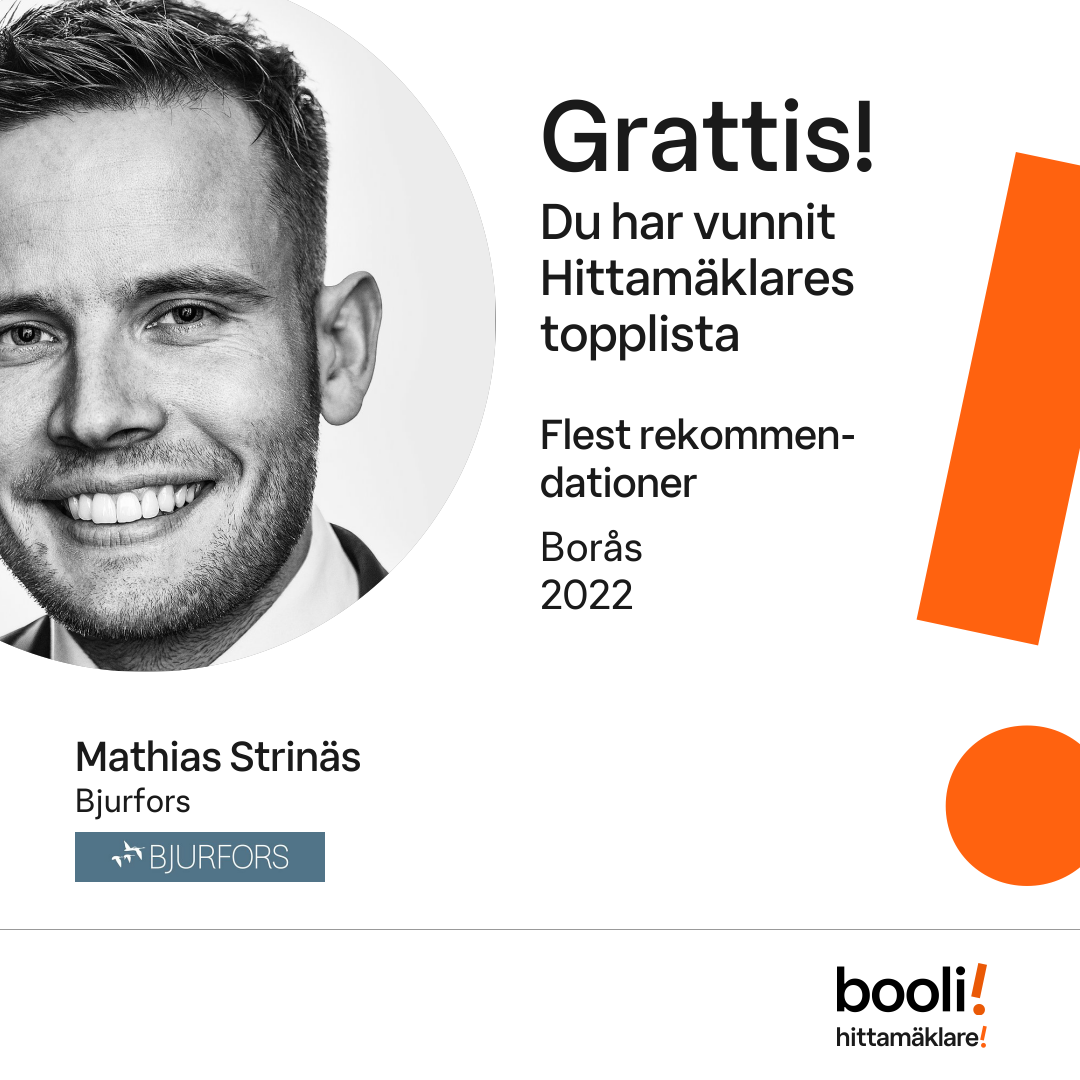 Statistik för publicerade bostäder, försäljningar och omdömen baseras på data från Booli och Hittamäklare. Statistiken för försäljningar avser inrapporterade och verifierade slutpriser från mäklare eller av Booli inhämtade och verifierade slutpriser. Statistiken för publicerade bostäder baseras på information som publicerats på Booli.se. Statistik för omdömen och rekommendationer baseras på omdömen från säljare som lämnats via Booli och Hittamäklare.