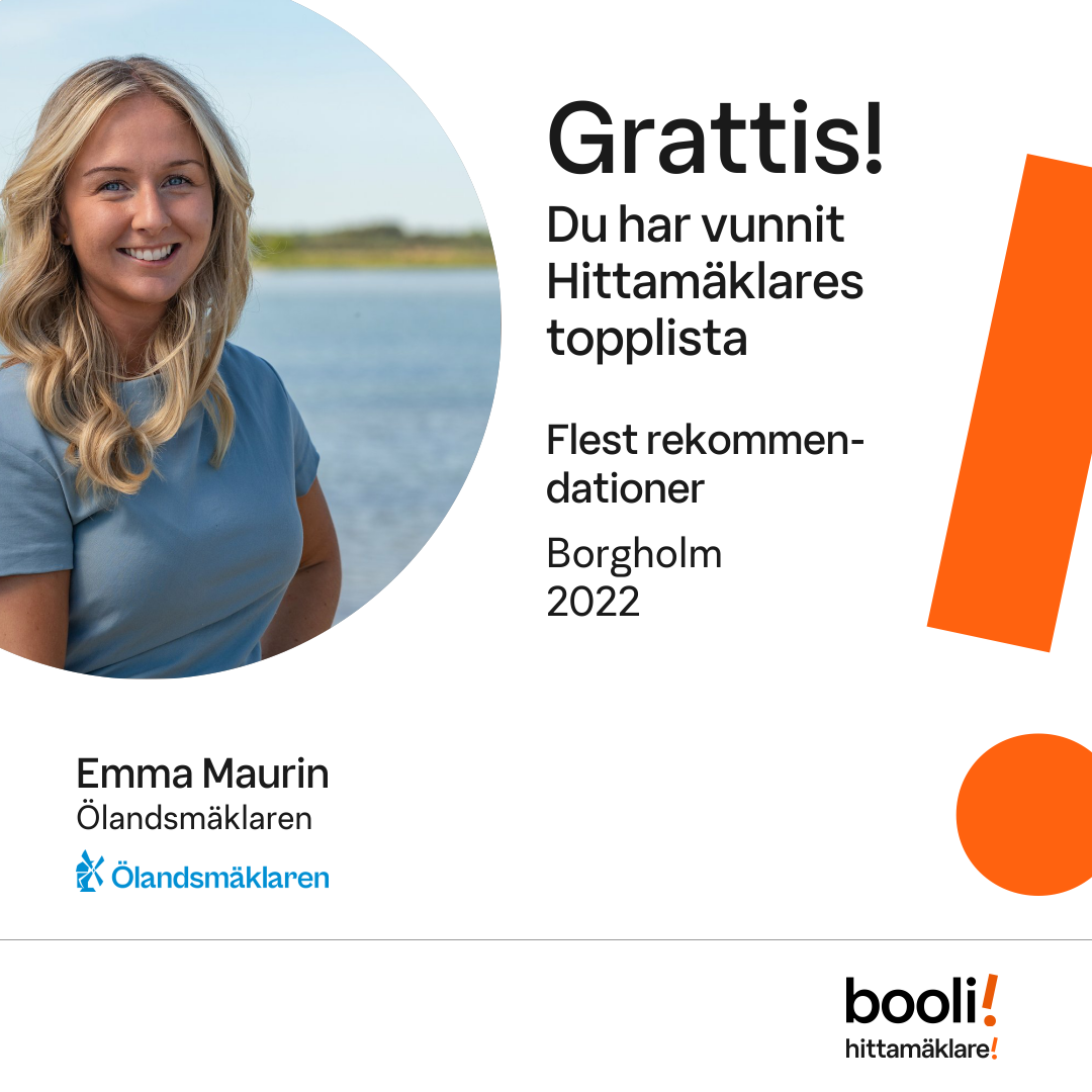 Statistik för publicerade bostäder, försäljningar och omdömen baseras på data från Booli och Hittamäklare. Statistiken för försäljningar avser inrapporterade och verifierade slutpriser från mäklare eller av Booli inhämtade och verifierade slutpriser. Statistiken för publicerade bostäder baseras på information som publicerats på Booli.se. Statistik för omdömen och rekommendationer baseras på omdömen från säljare som lämnats via Booli och Hittamäklare.