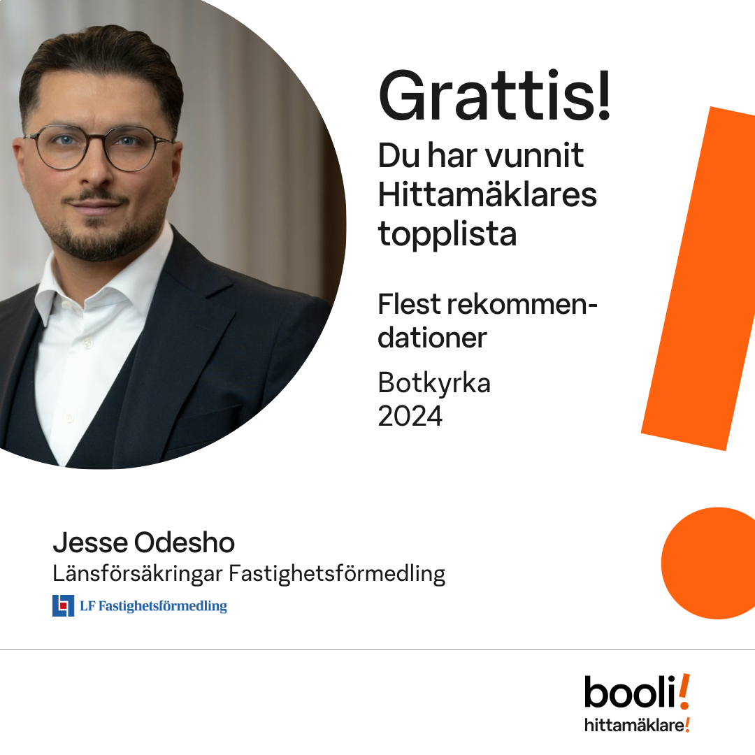 Statistik för publicerade bostäder, försäljningar och omdömen baseras på data från Booli och Hittamäklare. Statistiken för försäljningar avser inrapporterade och verifierade slutpriser från mäklare eller av Booli inhämtade och verifierade slutpriser. Statistiken för publicerade bostäder baseras på information som publicerats på Booli.se. Statistik för omdömen och rekommendationer baseras på omdömen från säljare som lämnats via Booli och Hittamäklare.