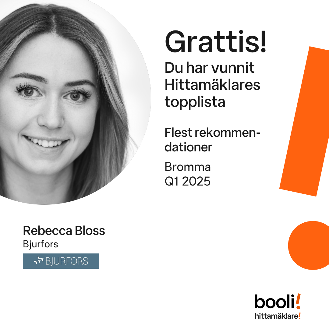 Statistik för publicerade bostäder, försäljningar och omdömen baseras på data från Booli och Hittamäklare. Statistiken för försäljningar avser inrapporterade och verifierade slutpriser från mäklare eller av Booli inhämtade och verifierade slutpriser. Statistiken för publicerade bostäder baseras på information som publicerats på Booli.se. Statistik för omdömen och rekommendationer baseras på omdömen från säljare som lämnats via Booli och Hittamäklare.
