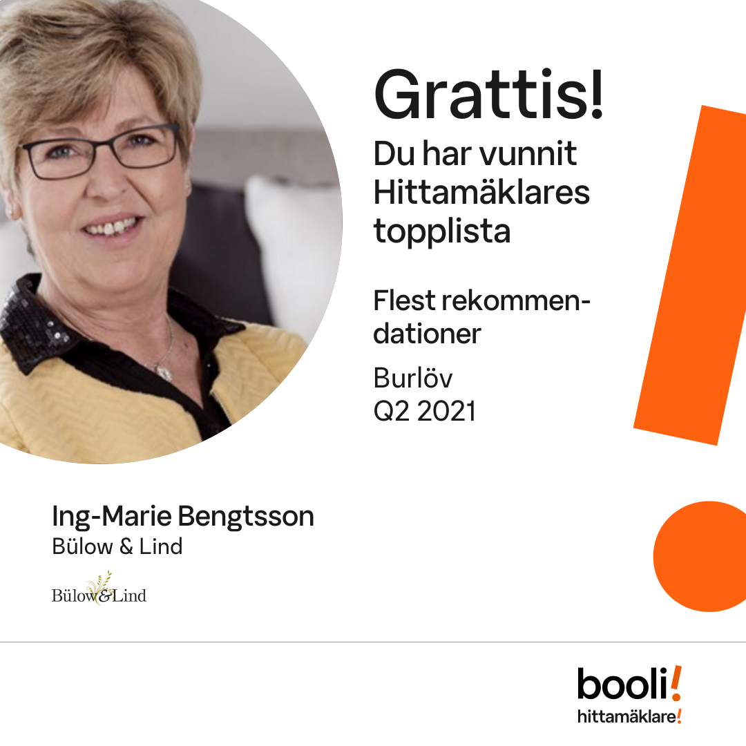 Statistik för publicerade bostäder, försäljningar och omdömen baseras på data från Booli. Statistiken för försäljningar avser inrapporterade och verifierade slutpriser från mäklare eller av Booli inhämtade och verifierade slutpriser. Statistiken för publicerade bostäder baseras på information som publicerats på Booli.se. Statistik för omdömen och rekommendationer baseras på omdömen från säljare som lämnats via Booli.