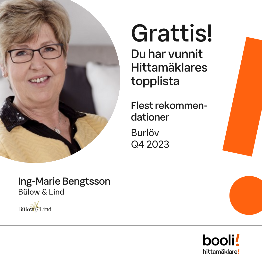 Statistik för publicerade bostäder, försäljningar och omdömen baseras på data från Booli och Hittamäklare. Statistiken för försäljningar avser inrapporterade och verifierade slutpriser från mäklare eller av Booli inhämtade och verifierade slutpriser. Statistiken för publicerade bostäder baseras på information som publicerats på Booli.se. Statistik för omdömen och rekommendationer baseras på omdömen från säljare som lämnats via Booli och Hittamäklare.